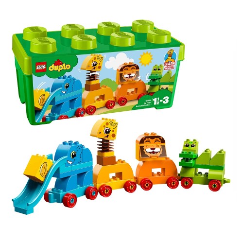 A Minha Primeira Caixa com Peças de Animais da Lego Duplo para as crianças pequenas terem tanta diversão construindo seu próprio comboio animal! Ajuda-os a classificar os tijolos em cores diferentes e conversar sobre cada animal icônico enquanto tu os constrói e desfrutar de um jogo criativo juntos: um elefante com um slide para um tronco, um crocodilo com maxilas articuladas, um leão com boca de abertura, uma girafa com um bendy pescoço e um pássaro branco. Os brilhantes e robustos tijolos LEGO® DUPLO® são especialmente concebidos para serem divertidos e seguros para pequenas mãos e entrar numa caixa de armazenamento acessível.